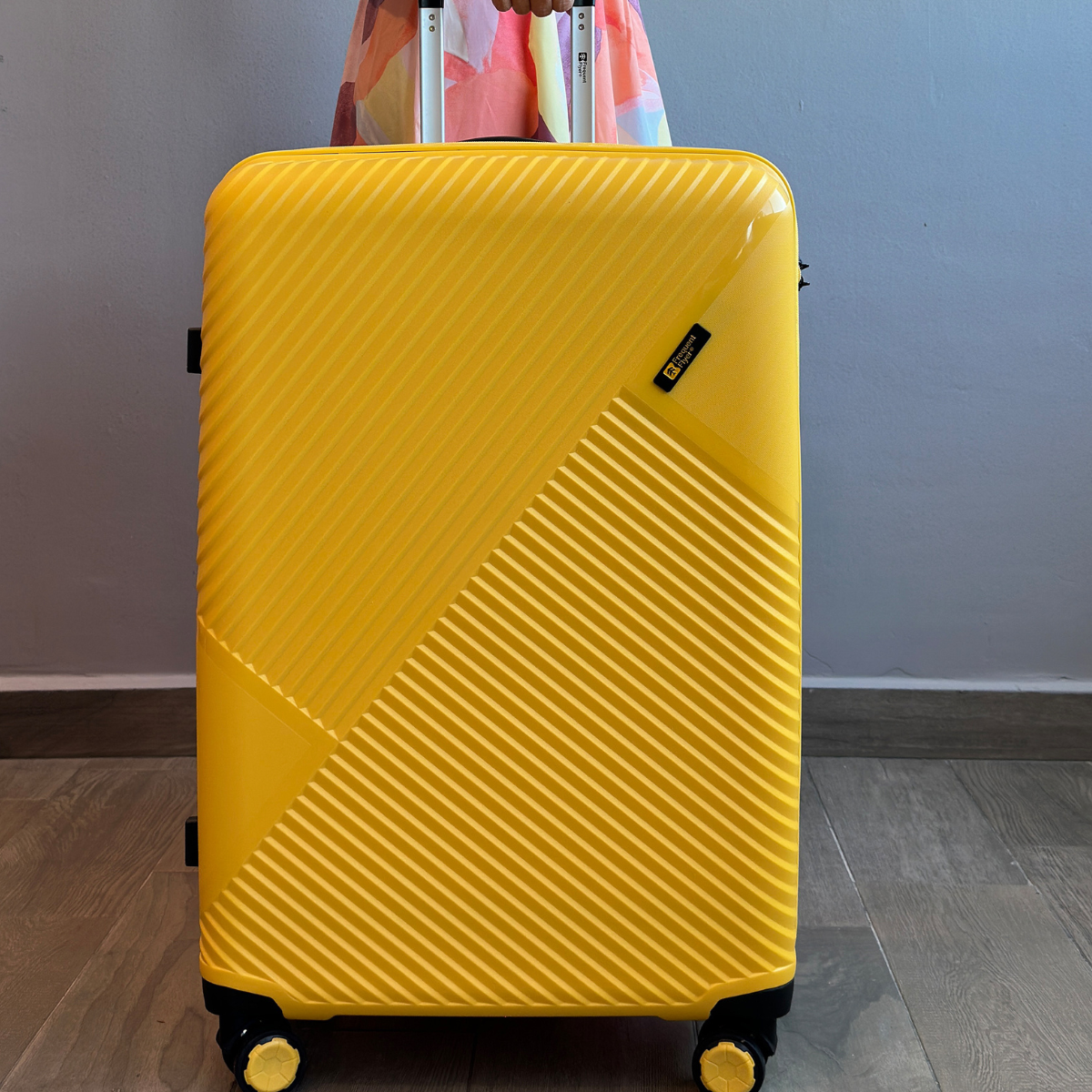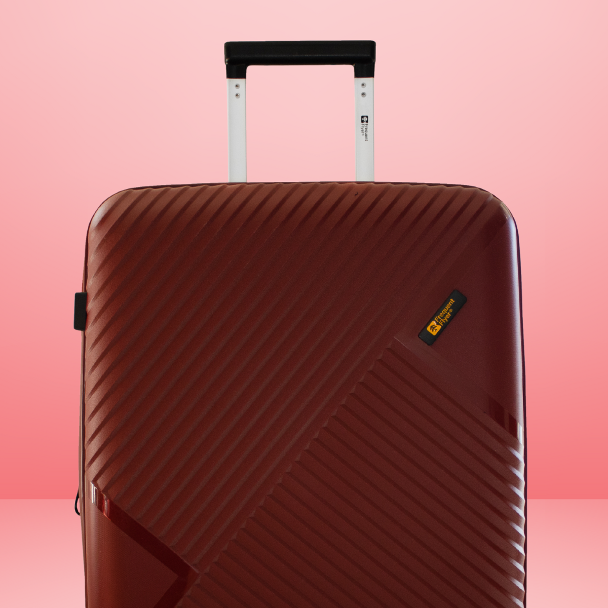 Exterior: Bastón telescópico retráctil con botón liberador. Asa de mano superior y lateral. Cierre expandible para incrementar el volumen de la maleta.