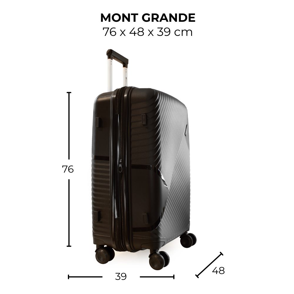 Exterior: Bastón telescópico retráctil con botón liberador. Asa de mano superior y lateral. Cierre expandible para incrementar el volumen de la maleta.