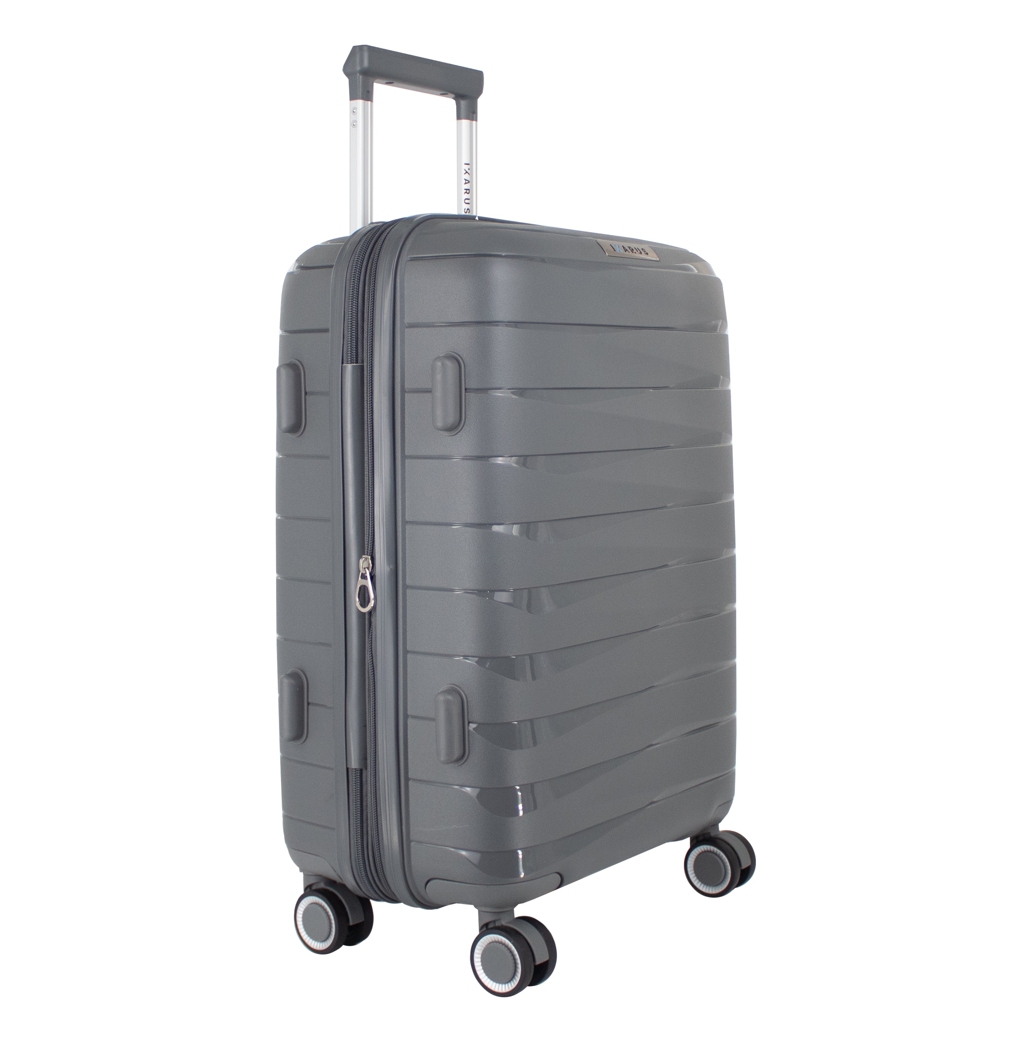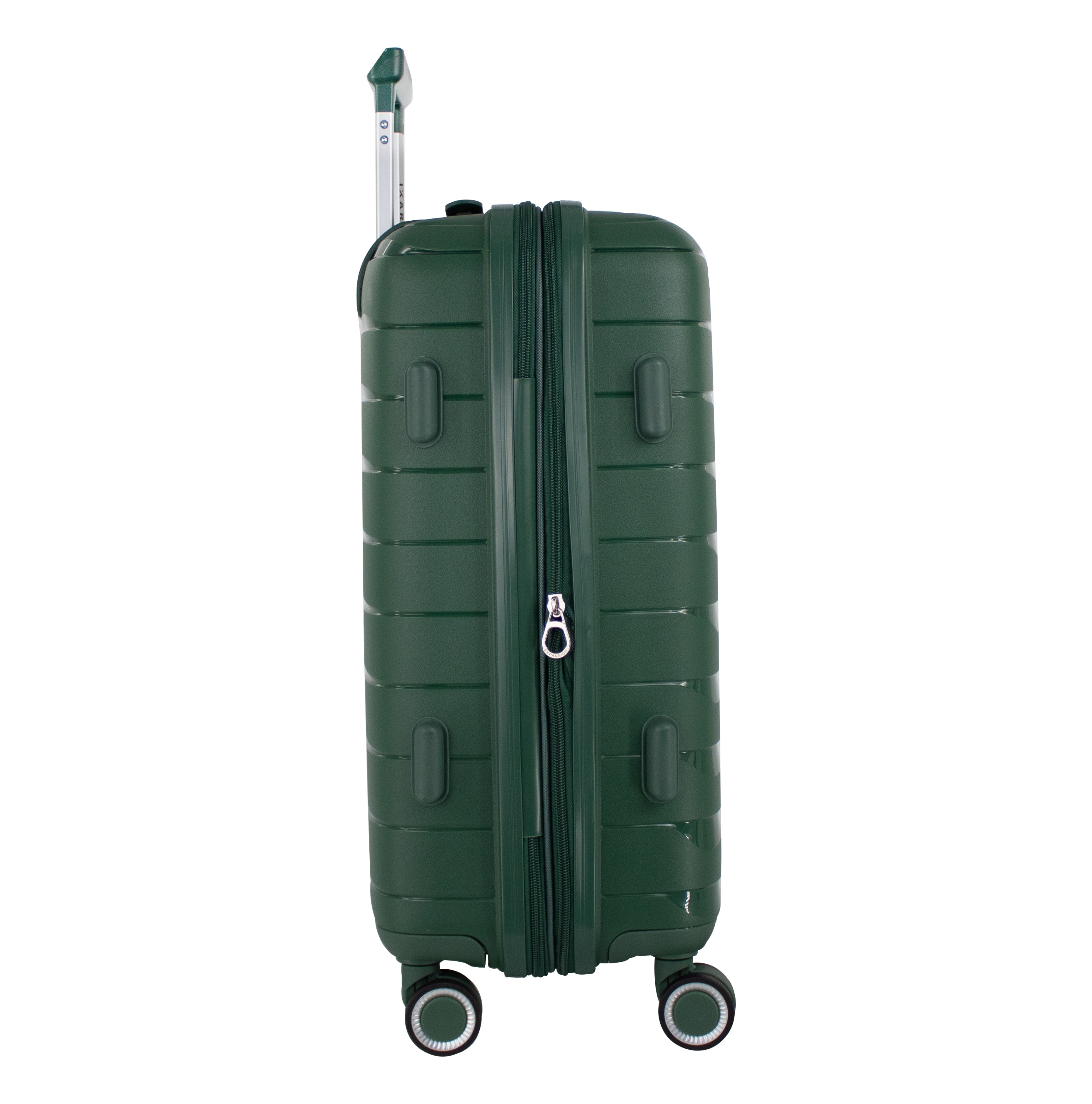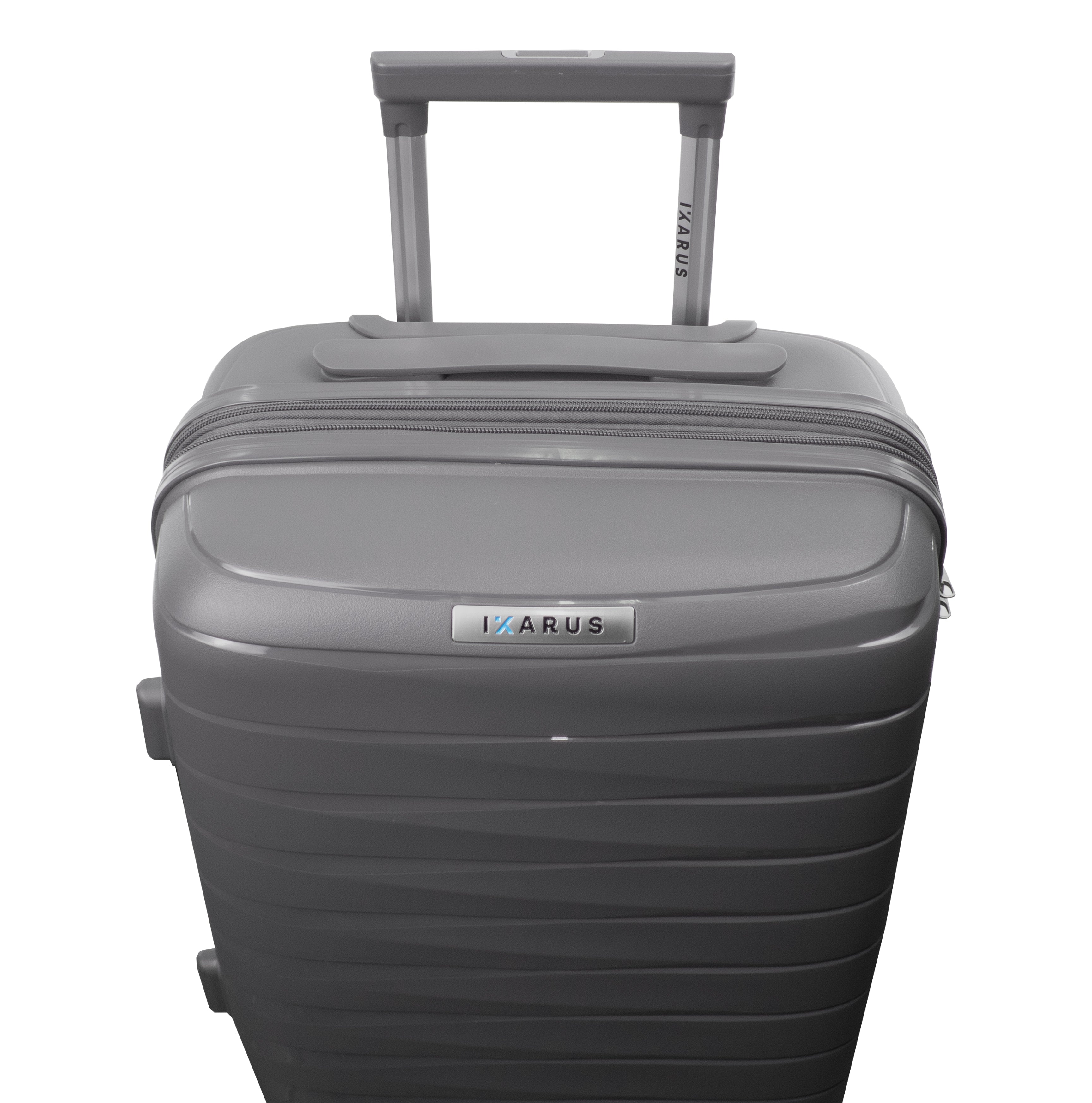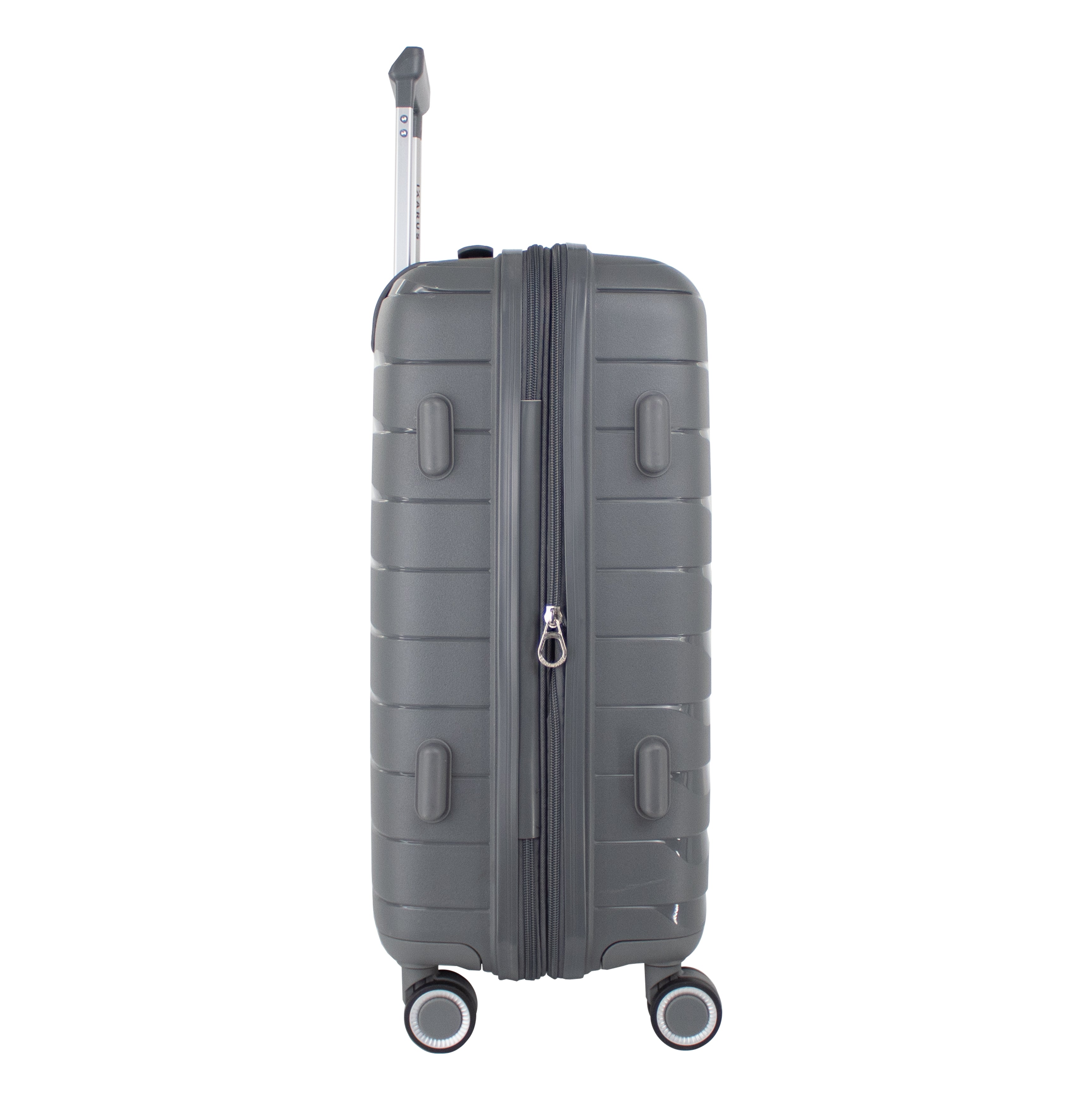 Exterior: Bastón telescópico retráctil con botón liberador. Asa de mano superior y lateral. Cierre expandible para incrementar el volumen de la maleta.