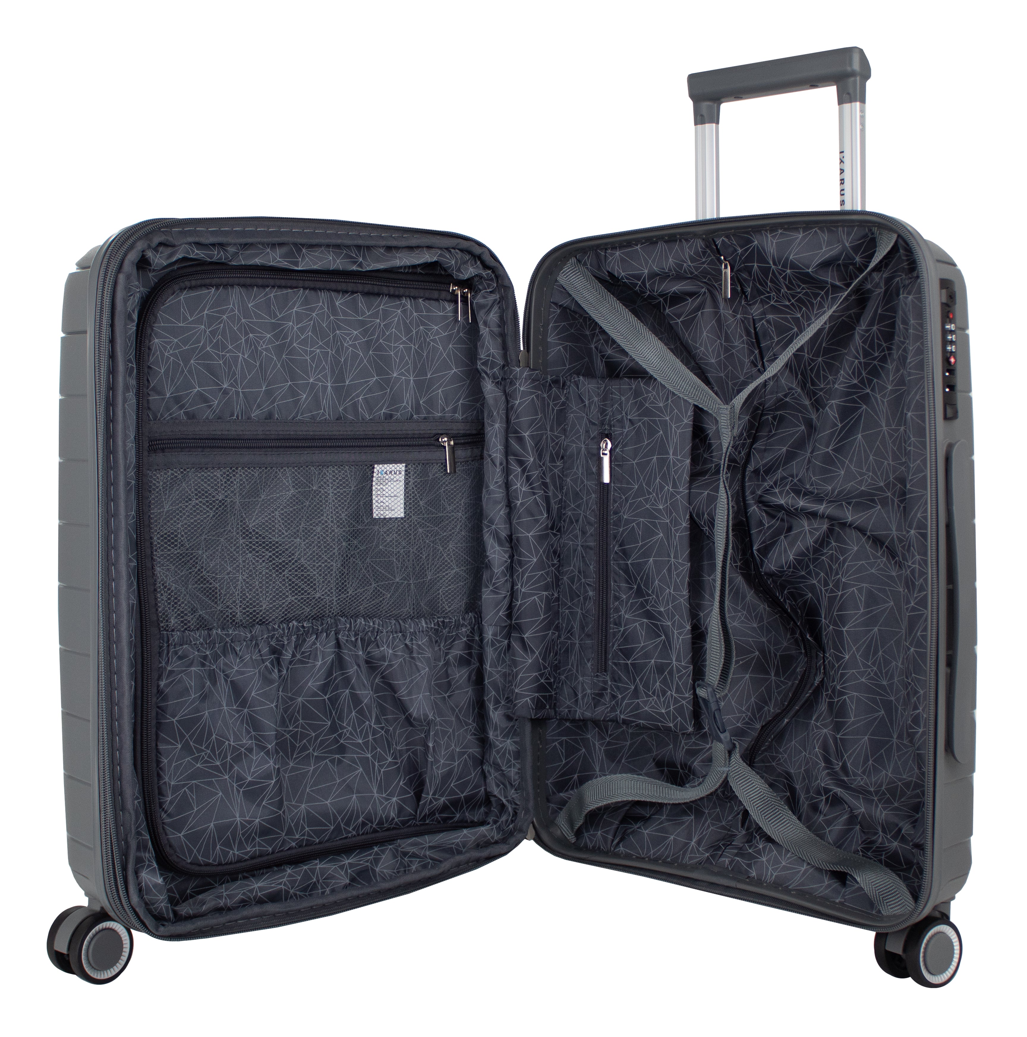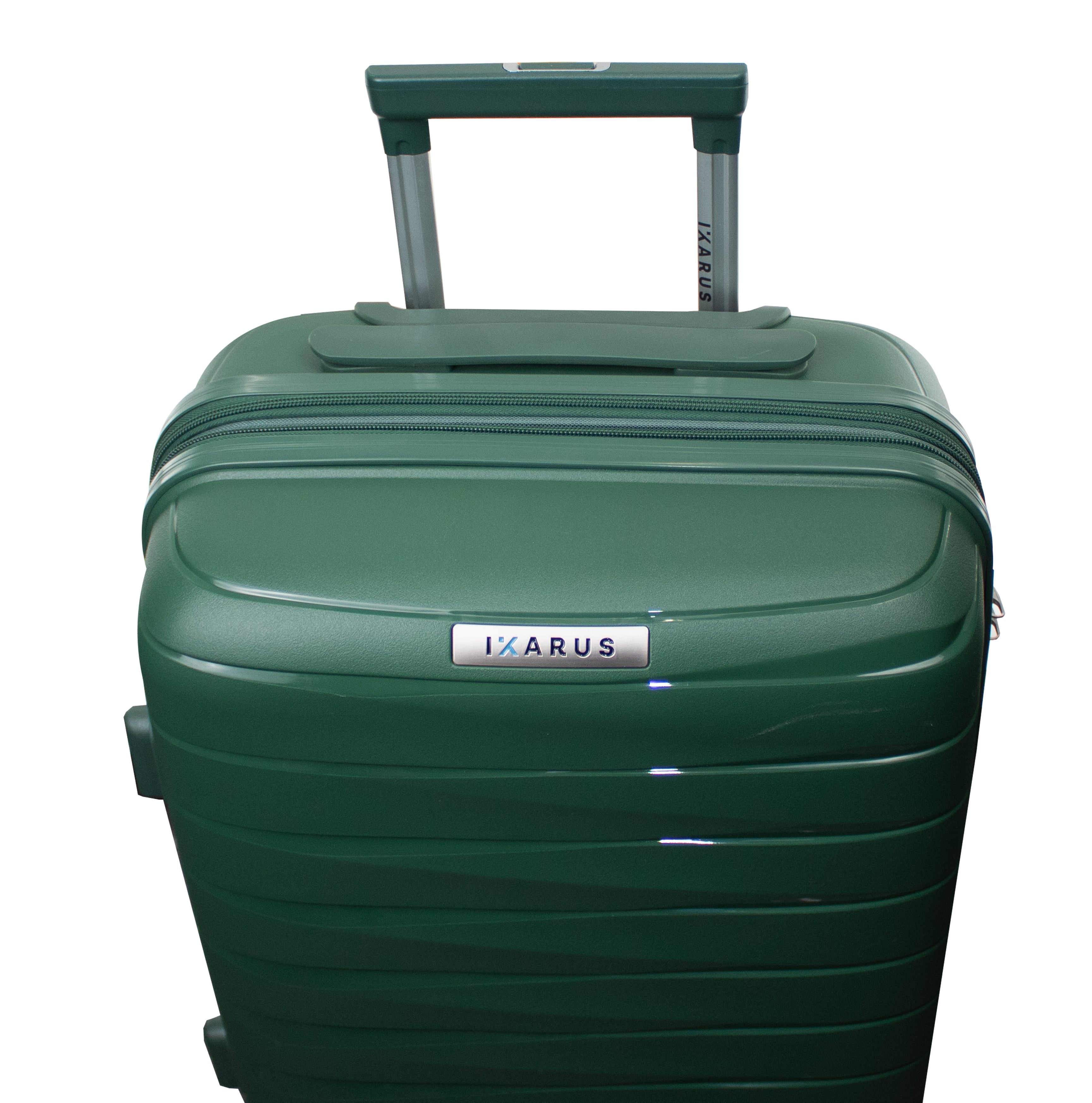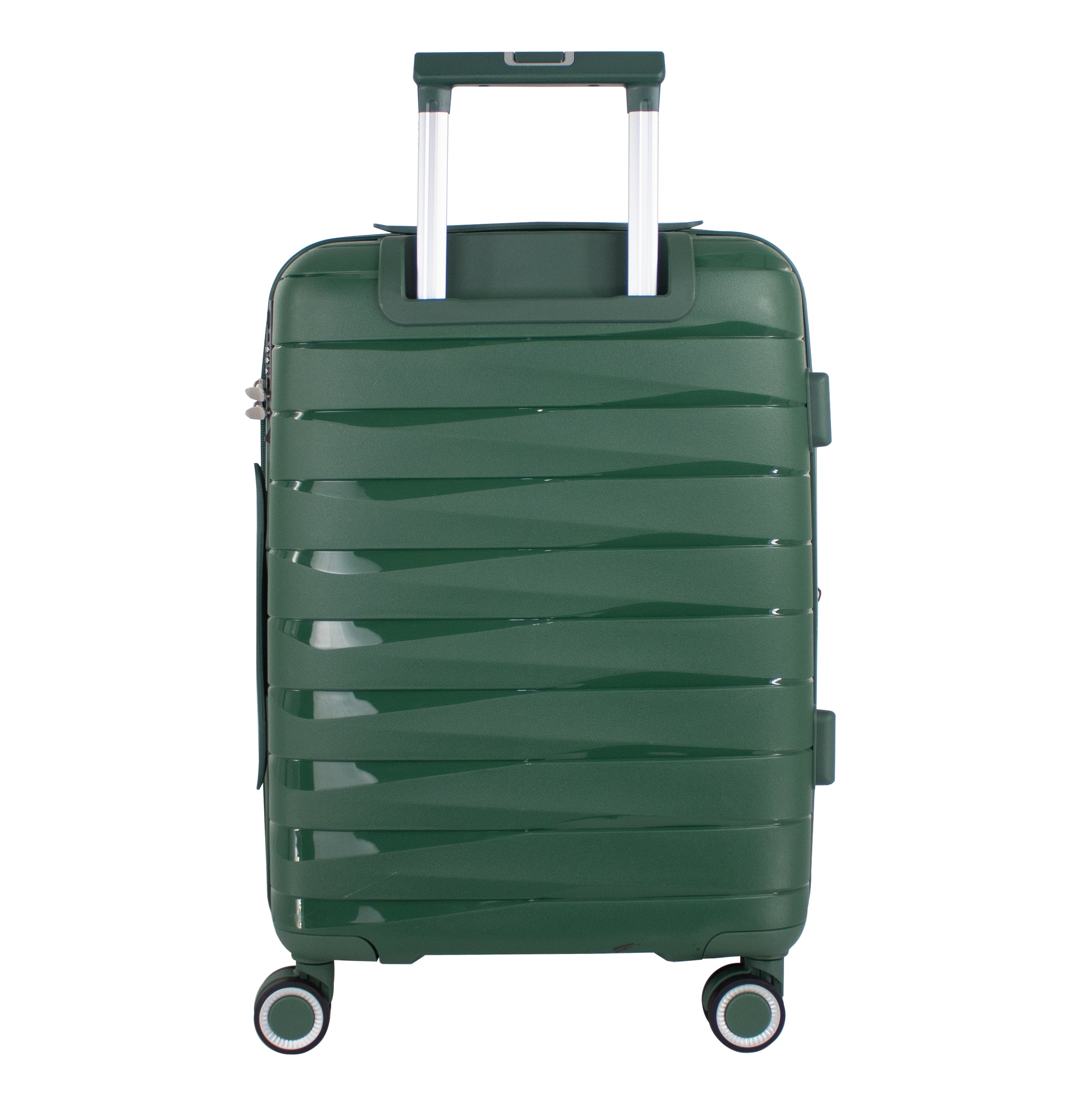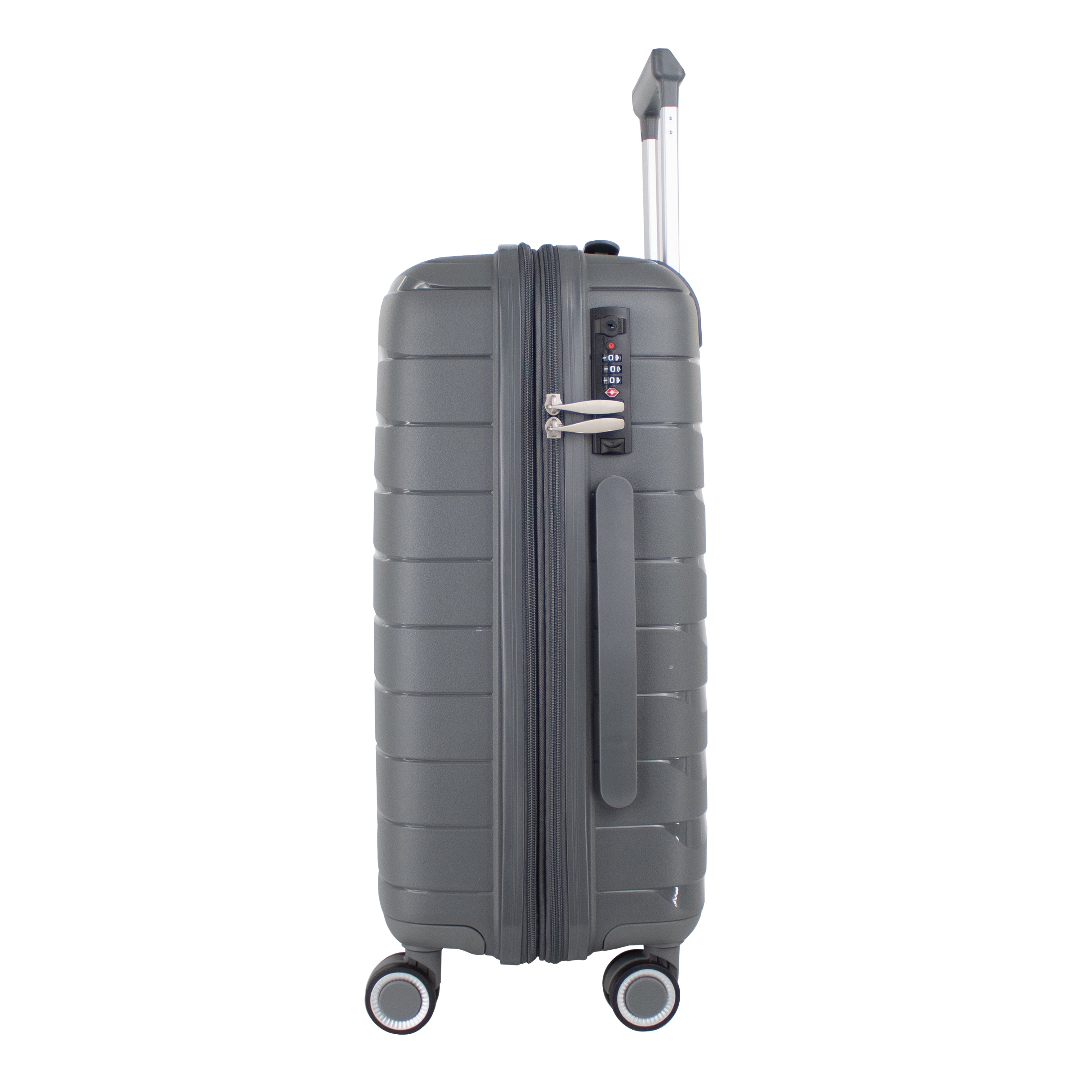 Exterior: Bastón telescópico retráctil con botón liberador. Asa de mano superior y lateral. Cierre expandible para incrementar el volumen de la maleta.