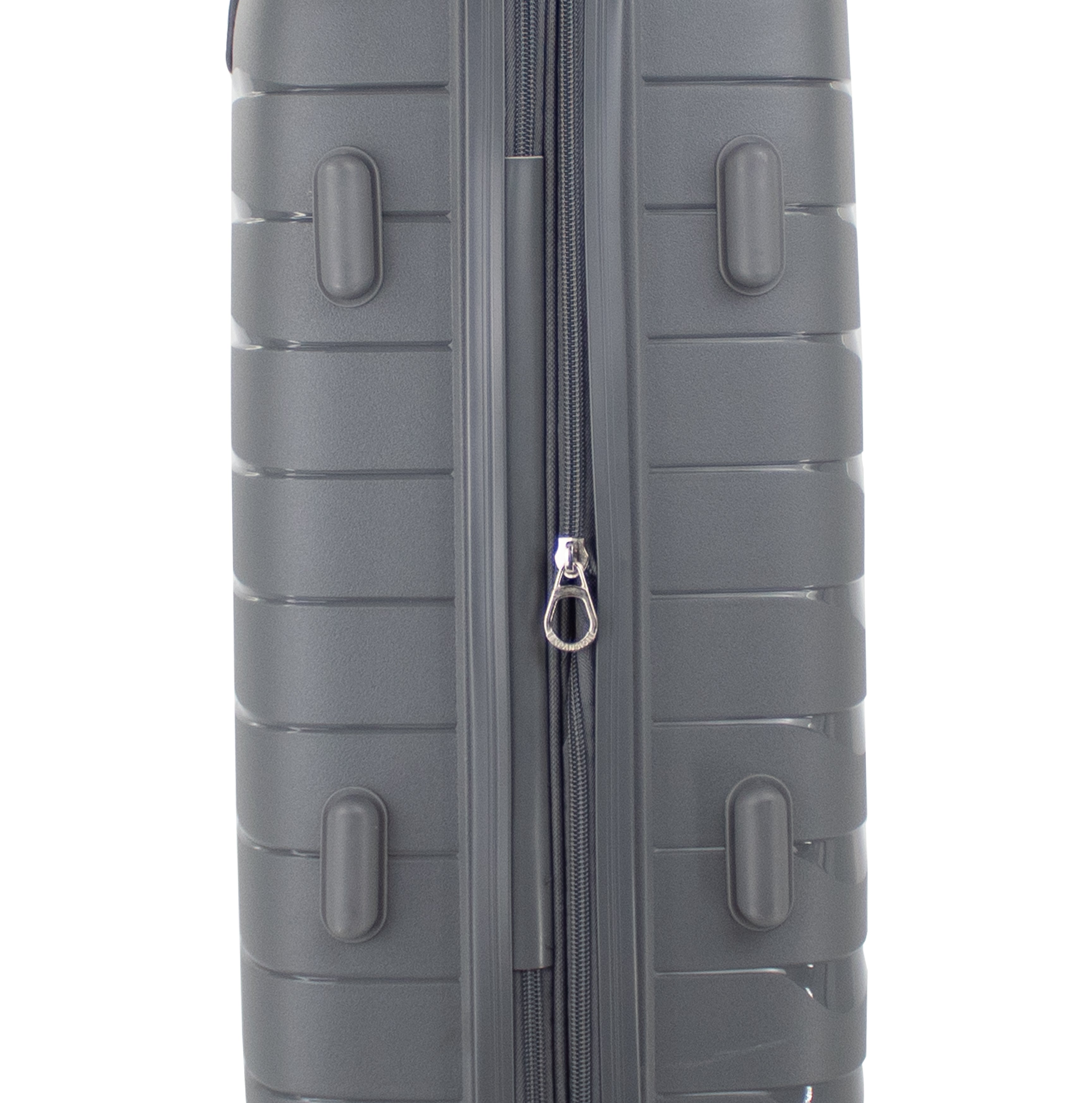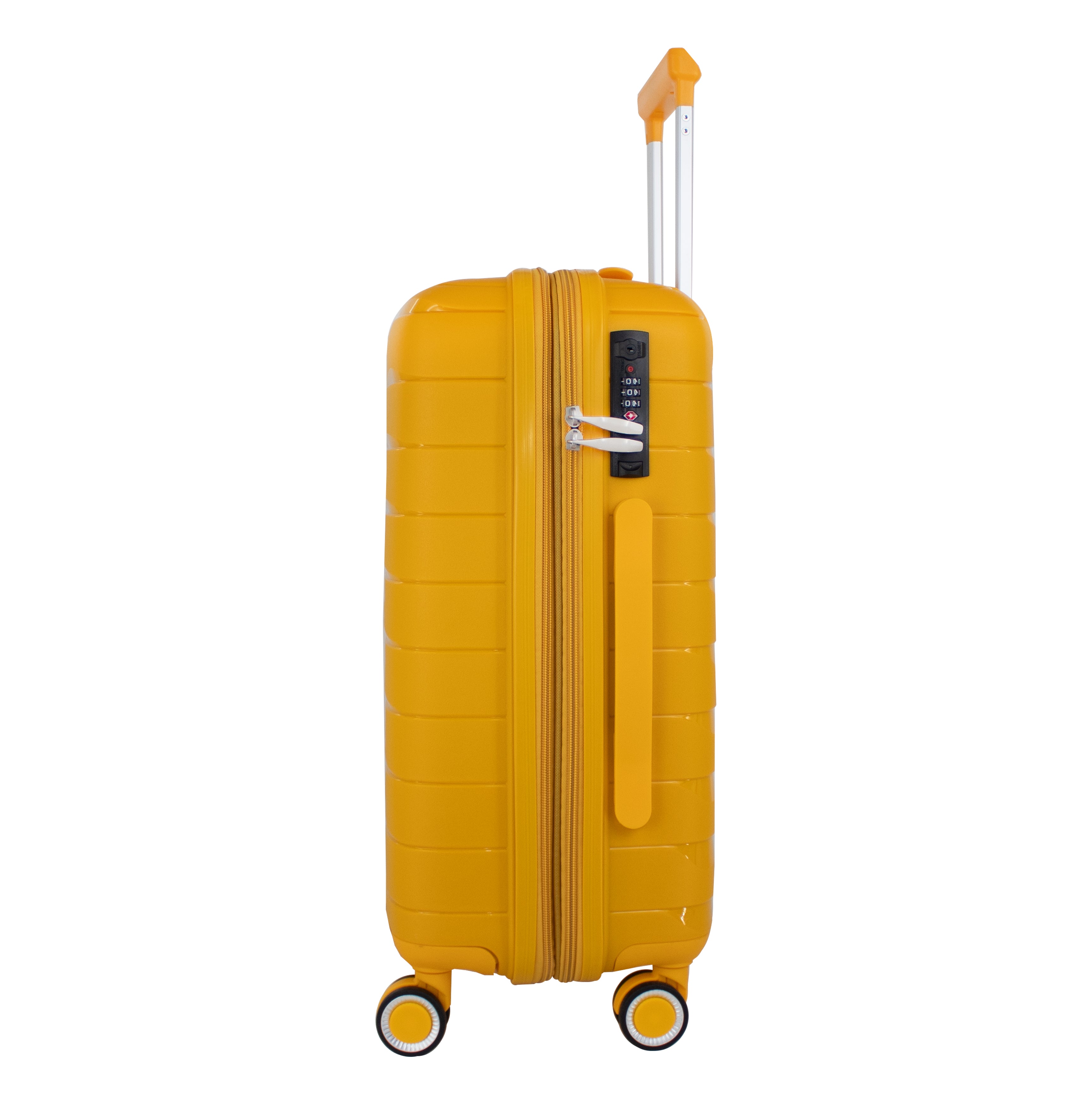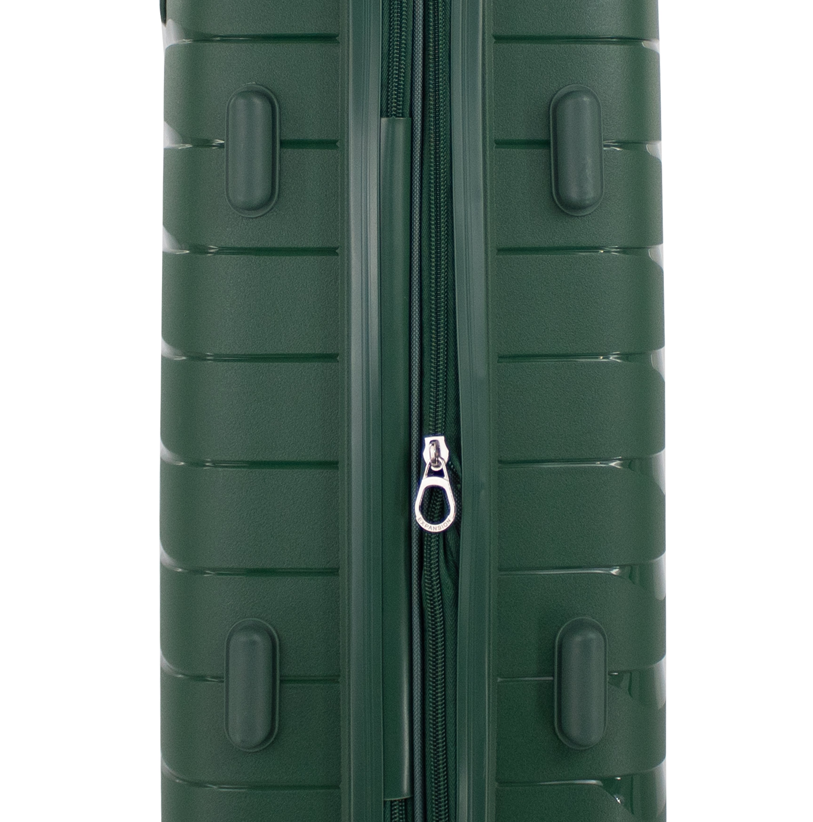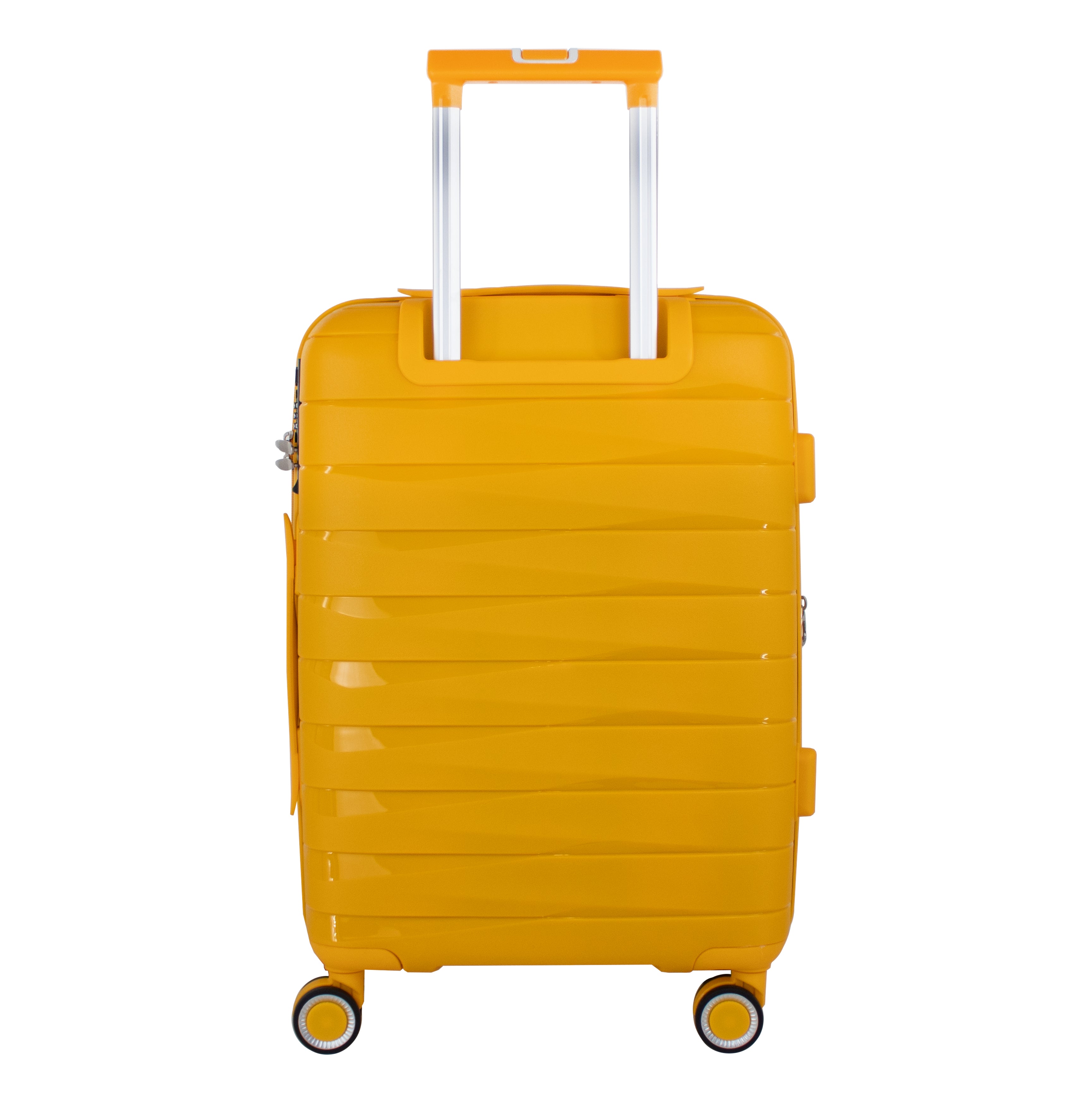 Exterior: Bastón telescópico retráctil con botón liberador. Asa de mano superior y lateral. Cierre expandible para incrementar el volumen de la maleta.