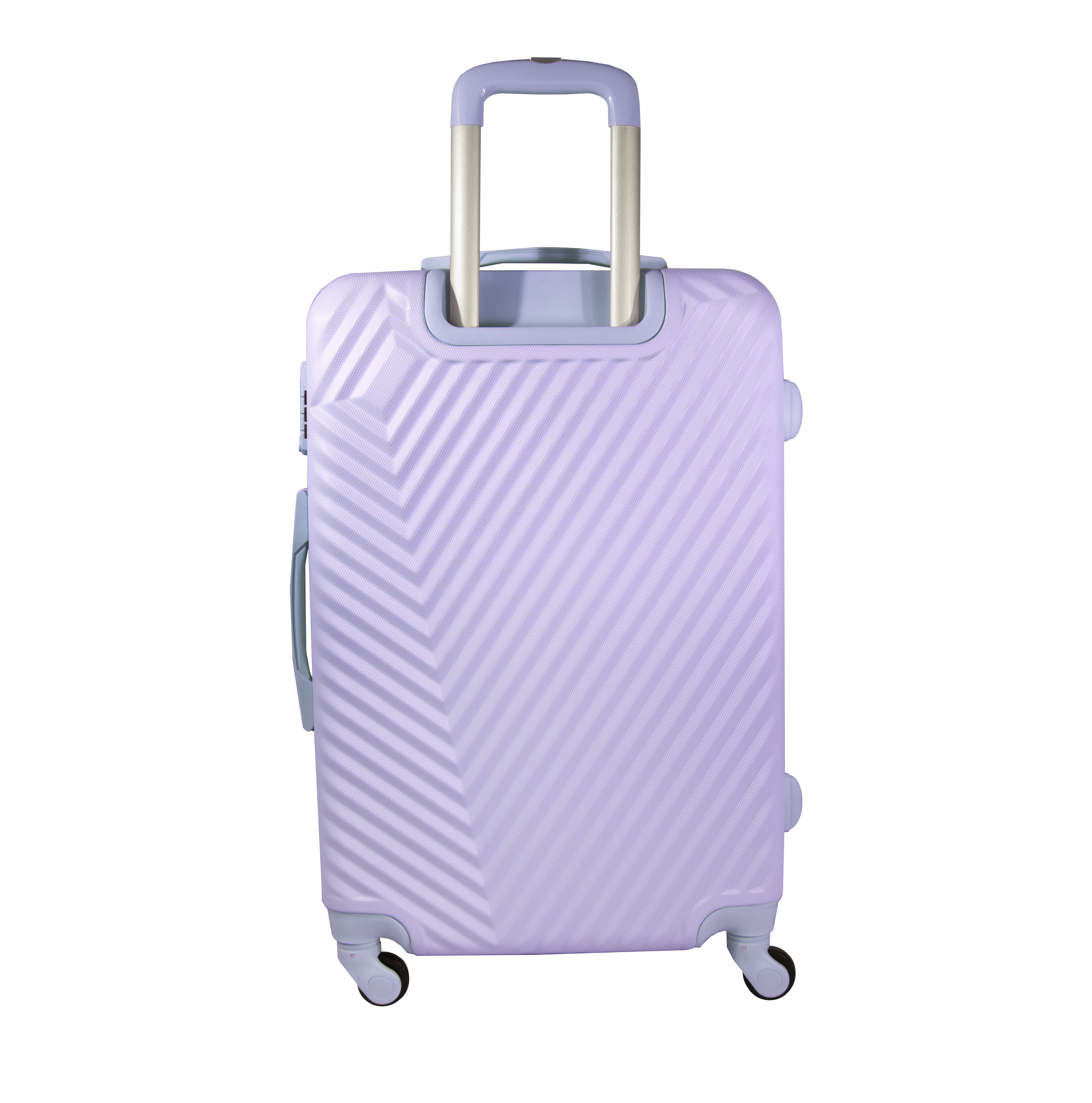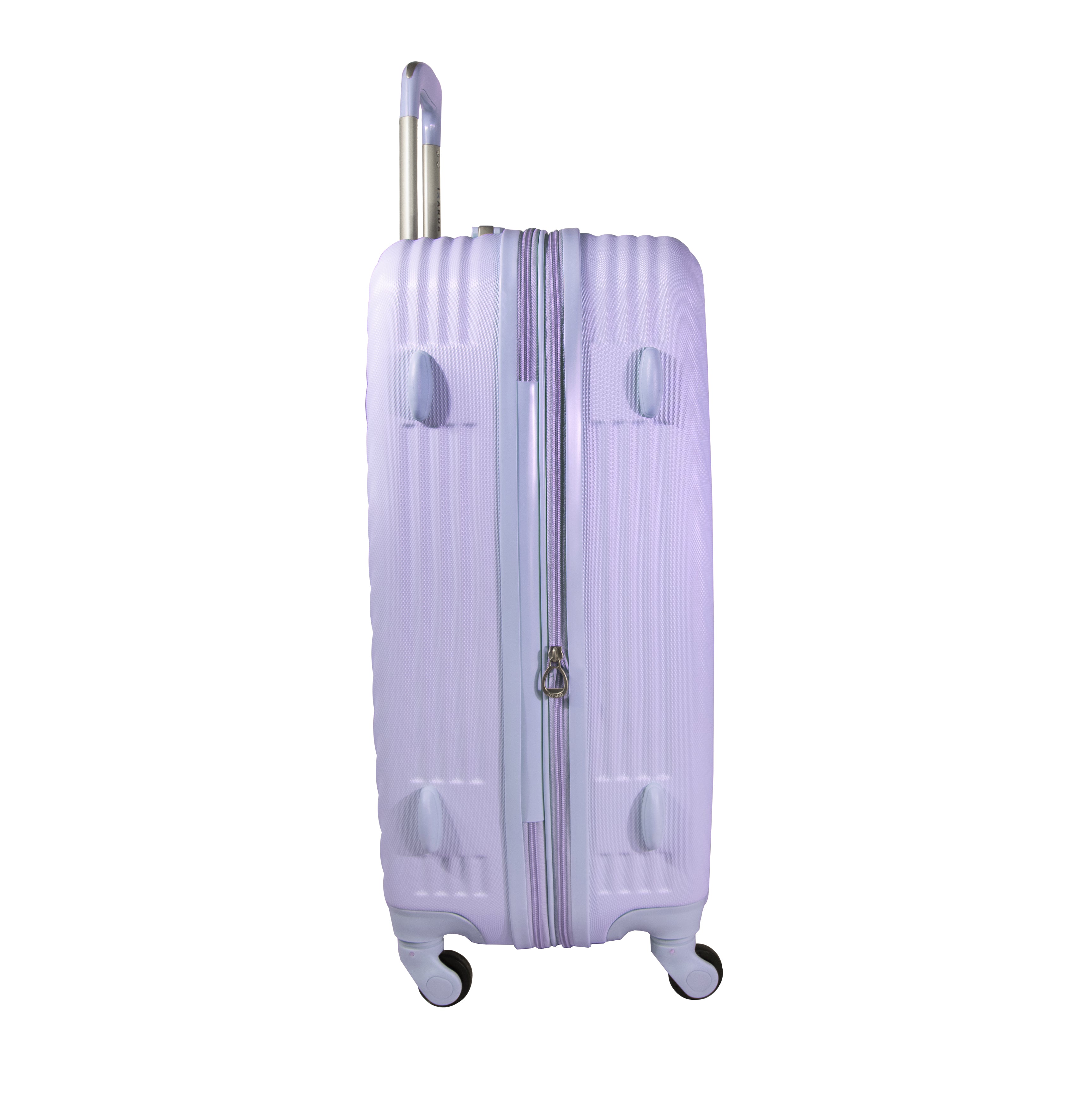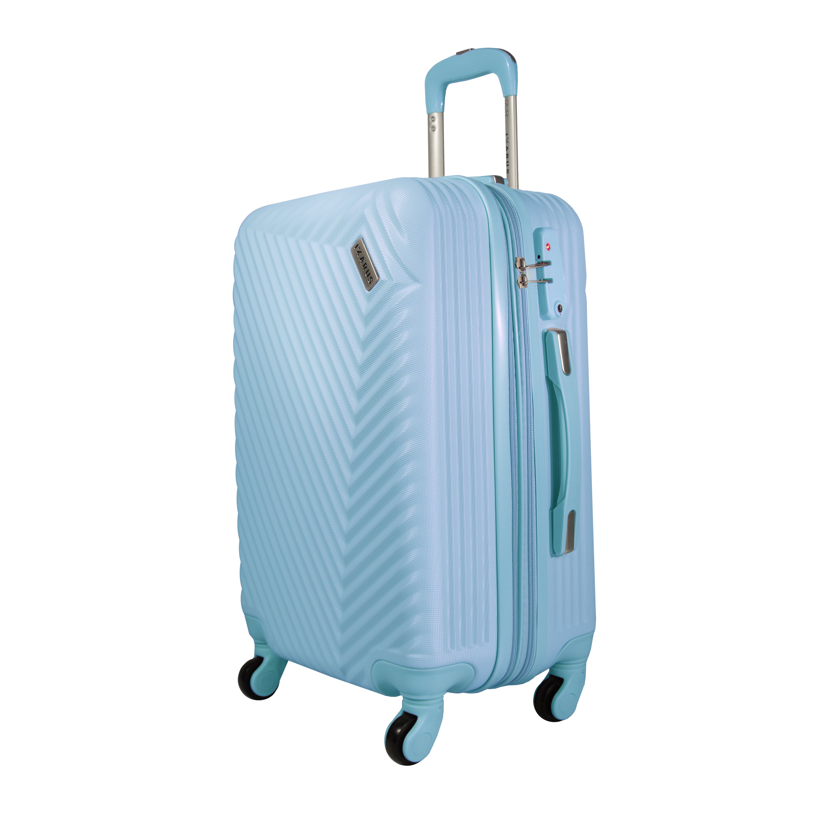 Exterior: Bastón telescópico retráctil con botón liberador. Asa de mano superior y lateral. Cierre expandible para incrementar el volumen de la maleta.