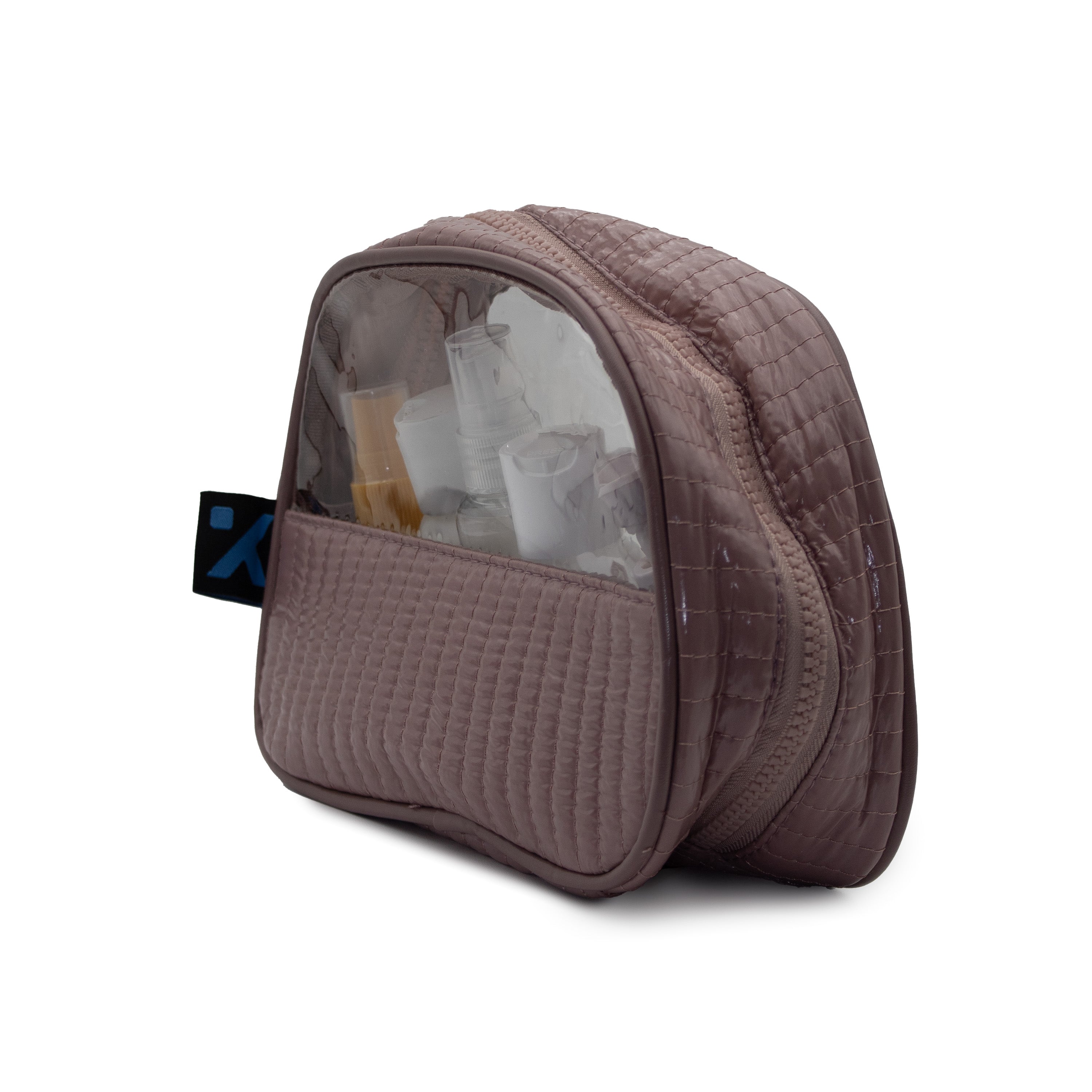 El diseño presenta una base de material resistente con una elegante textura acolchada vertical en color azul, y es perfecta para llevar tus esenciales de skincare o artículos de tocador de tamaño viajero.