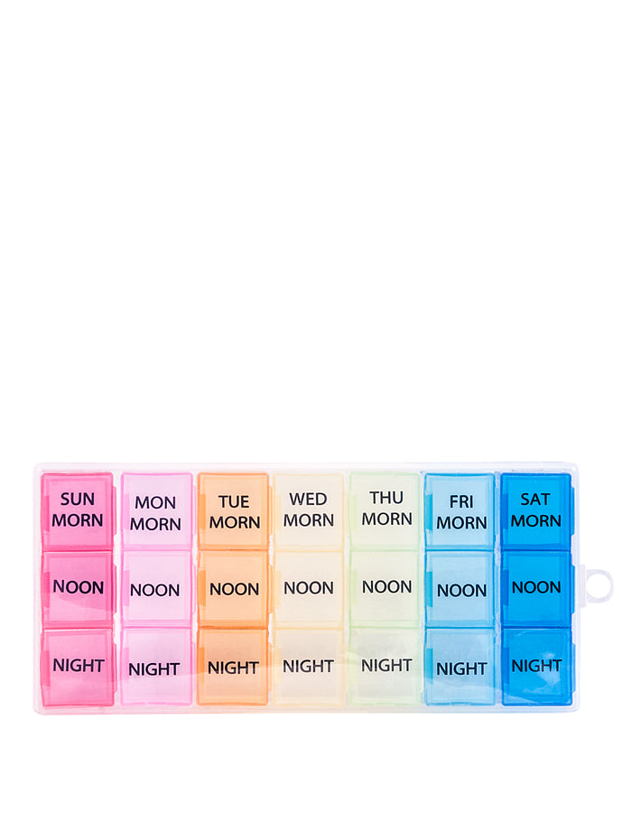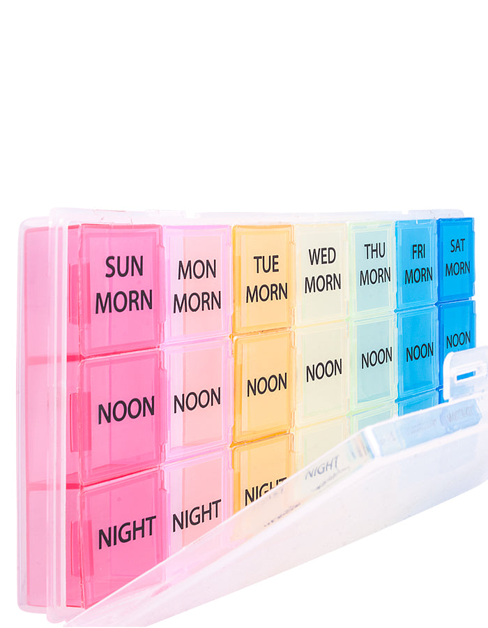 Este pastillero cuenta con 3 compartimentos individuales, uno para cada toma diaria, lo que te permite planificar y organizar tus medicamentos de manera eficiente. Además, su formato semanal te brinda una visión clara de tus dosis diarias, evitando confusiones y olvidos.